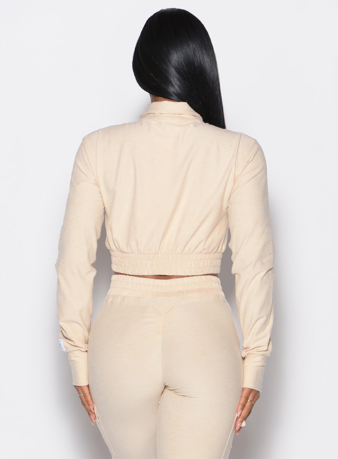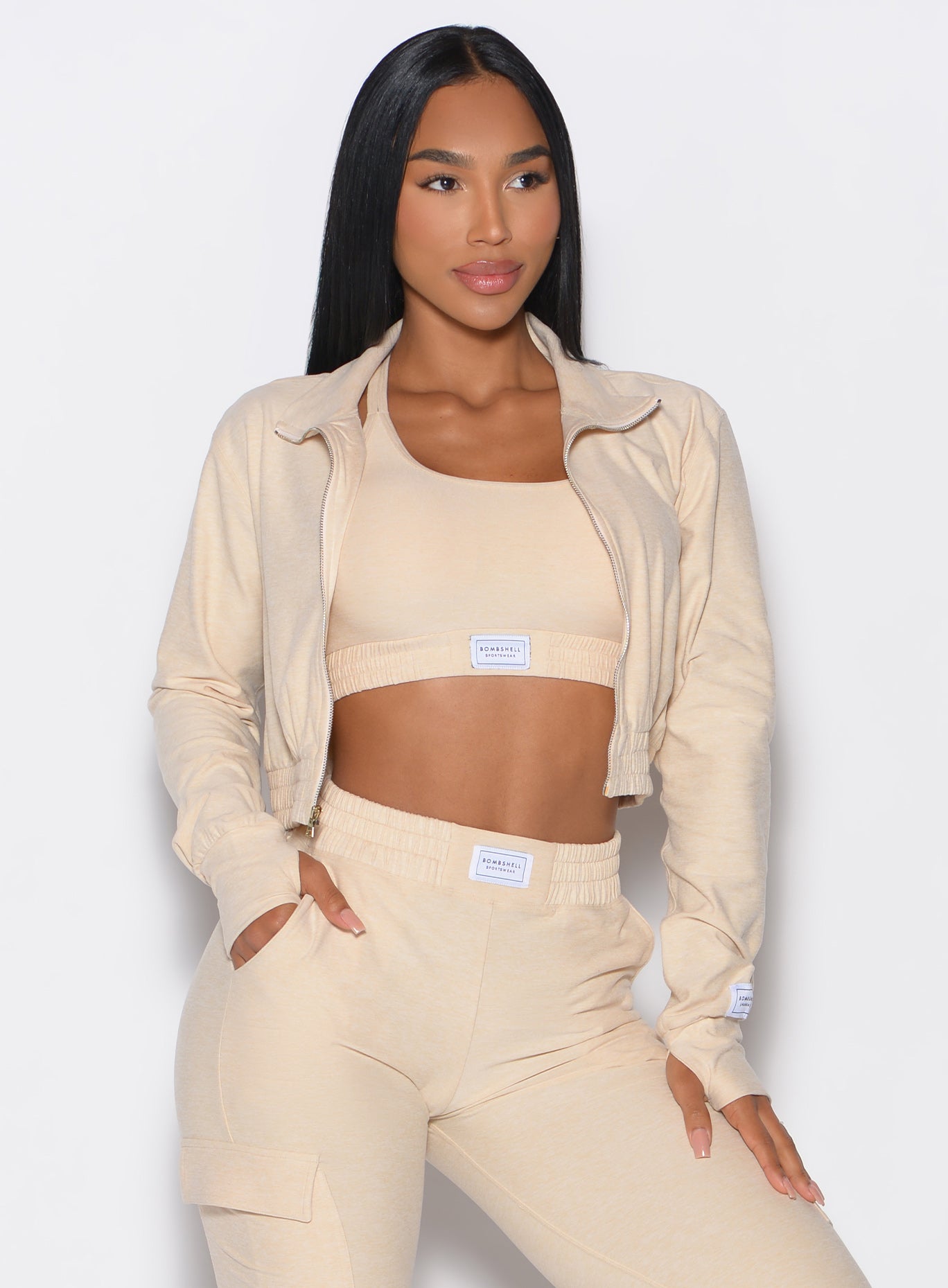 Meet the Cloud Crop Jacket. your go-to for everyday wear and lounging. With a mock high neck and full zip front. this jacket is both versatile and stylish. Thumb holes and scrunch detail add a contemporary touch. while the flatlock detailed stitching enhances durability. Made from light. airy fabric. it’s incredibly comfortable and pairs perfectly with our cloud shorts. Finished with a woven branded label. this jacket combines practicality with a chic. modern look and pairs perfectly with our cloud shorts and joggers.