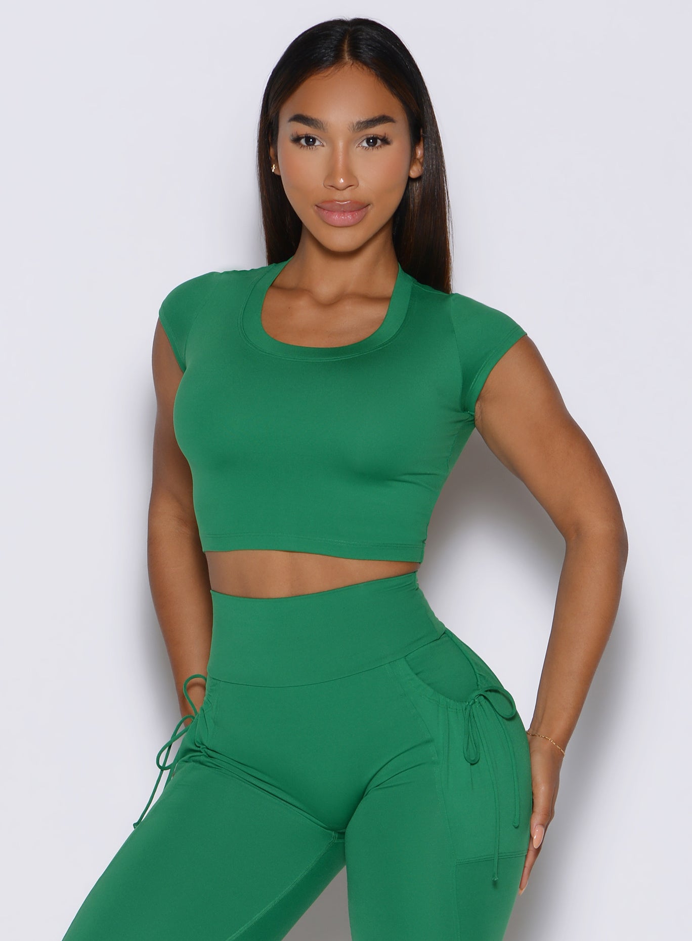 Add vibrant energy with the FitBoost Tee in fresh field green. This green crop tee features a classic silhouette that never goes out of style. The round neck tee offers comfortable coverage with a timeless neckline that sits perfectly without gaping or riding up. Constructed from soft-touch fabric with just enough stretch to move freely during dynamic exercises while maintaining its structured shape throughout the day.