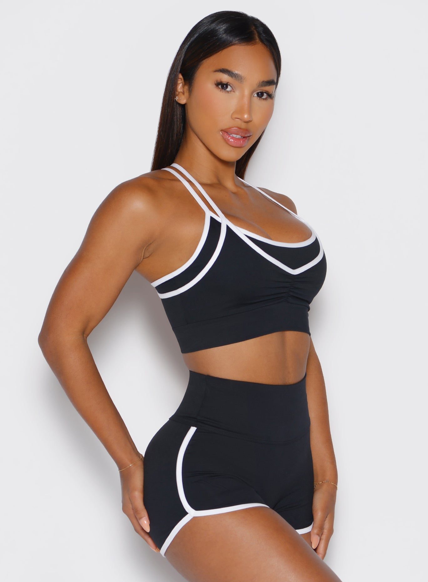 The Power Line Bra in Black brings together sleek design and reliable performance. This x back sports bra is made with buttery soft fabric and features a double layer front and back for added support. Adjustable double straps and removable padding allow for a customized fit. while the front scrunch detail adds subtle shape. The black and white sports bra design with contrast binding creates a timeless athletic look that works for training and daily wear. Built as a high performance sports bra. it offers comfort. versatility. and a modern edge for every active lifestyle.